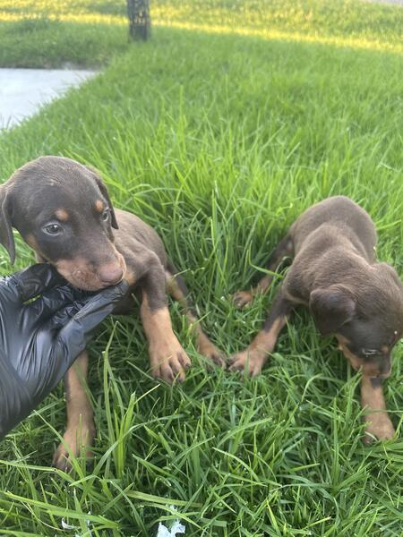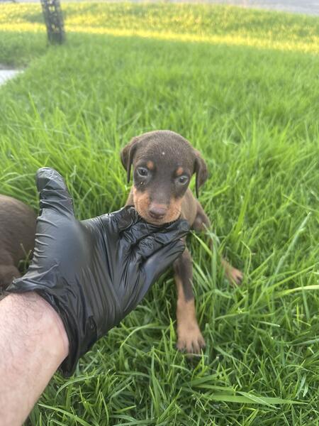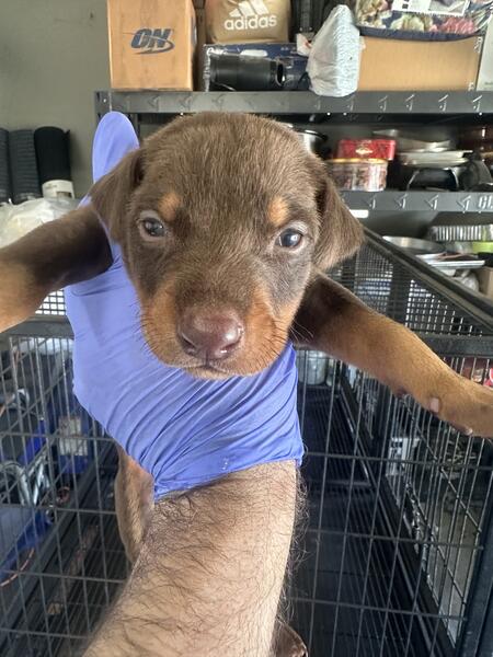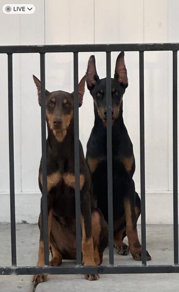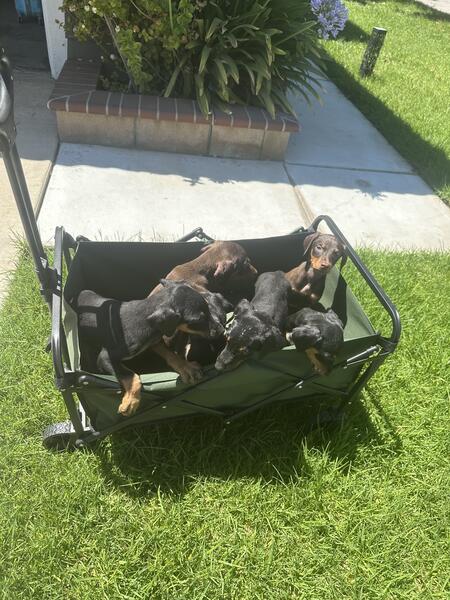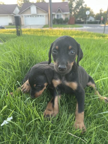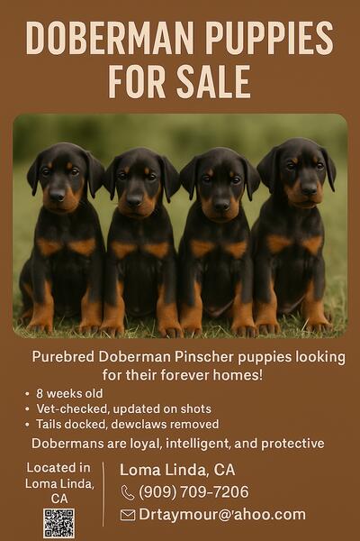 message drtaymour about this ad Very active and healthy about 12 weeks old standard black and rust females. Doberman that has her tails docked, dewclawed, UTD vaccines with records 3X, dewormed 3X and vet checked! Parents are here on premises to meet and greet. Dad is European standard black big boy 110lbs and mom is American red These puppies as well as their parents were raised with our family and kids. They have a good temperament and are very friendly and sweet pups. Call or text 909 seven -zero-nine 7206 |