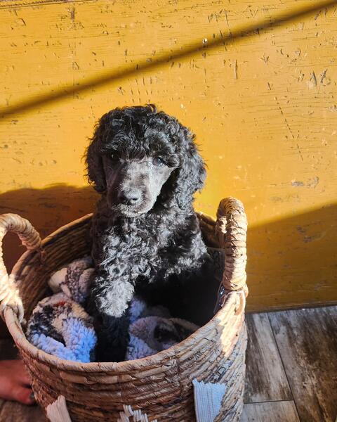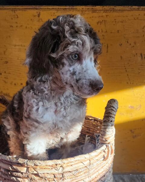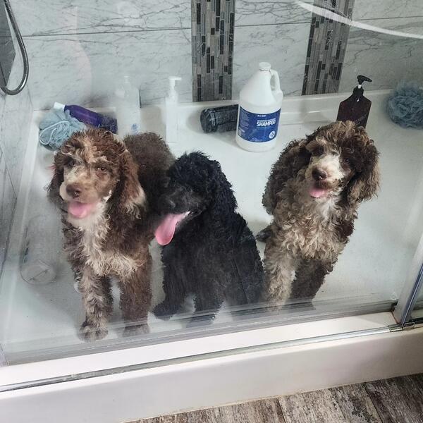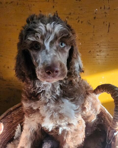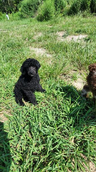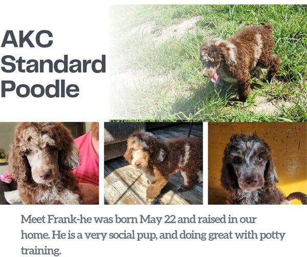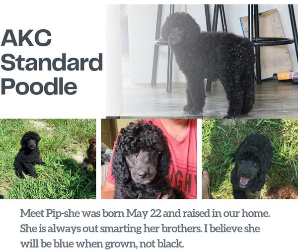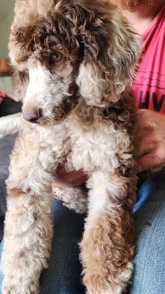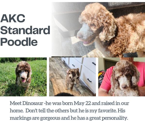message lotzpoodles about this ad Reduced We have three AKC poodle pups available. Born May 22. The female, Pip is the solid colored one, she will either be black or a dark blue. Dinosaur and Frank are both brown merles. They should mature to be around 50-55lbs. They have received all their puppy shots, been dewormed several times, microchipped, will come with a fresh groom (feet, face, fany) These pups have been raised in the house by our kids so they have a great start to potty training. The dam is a silver and dad is blue merle. Located in St Peter IL but I do have transportation contacts. These pups will be hypoallergenic and make great pets. They are so ready to have their forever homes and continue to be spoiled. |