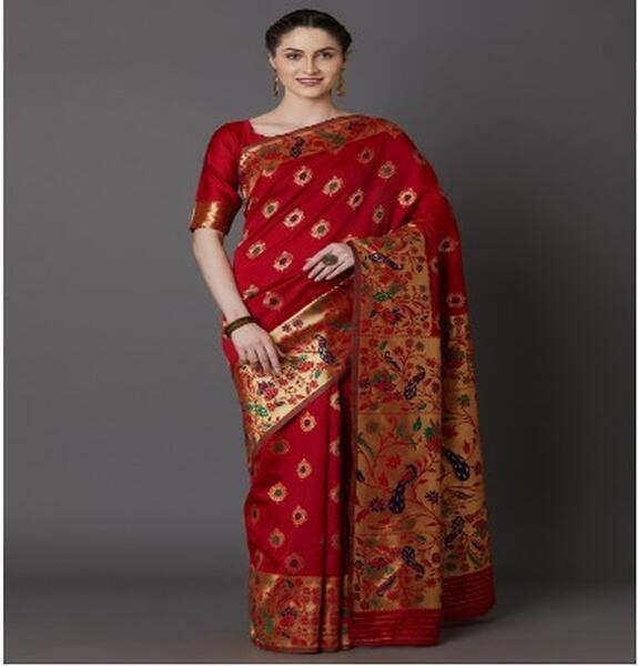 message rohinee about this ad Product Code: 11169652 Design Details: Red banarasi woven design saree and has a zari border Blouse Piece The model is wearing a stitched version of the blouse piece. The saree comes with an unstitched blouse piece Origin: Banarasi sarees originate from the city of Varanasi (Uttar Pradesh These are well known for the Mughal Era inspired designs in golden as well as silver brocade or Zari. Length: 5.5 metres plus 0.8 metre blouse piece Width: 1.06 metres (approx) Update your wardrobe staples with this exquisite traditional saree from Mitera. Match this red design with caged heels and statement jewellery when you have a event to attend. Saree fabric: silk blend Blouse fabric: silk blend Dry-clean |