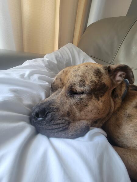 breed: pitbull and a mural