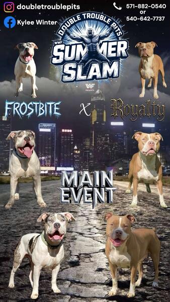 message kyleeokk about this ad WE ARE BEYOND PROUD OF THESE INCREDIBLE ROYALTY FROSTBITE PUPPIES! THEY CAME WITH A TON OF COLOR & A WHOLE LOT OF ATTITUDE! WHOS YOUR FAVORITE ATTITUDE ERA STAR? FOR ADDITIONAL INFORMATION ON AVAILABLE PUPPIES OR FUTURE BREEDINGS YOU CAN CONTACT US THROUGH THE FOLLOWING CHANNELS. * INSTAGRAM: @DOUBLETROUBLEPITS * PHONE: 540-642-7737 OR 571-882-0540 |