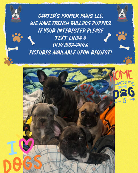message premierpurebredpaws about this ad Looking for a loving, playful addition to your family? Our beautiful 12 week old French bulldog puppy is ready to find her forever home! This pup is not only adorable but come with everything you could want in a new furry friend you will receiveComplete Ancestry History she has been pad trained dewormed and has had her first set of shots! Dont miss out on the opportunity to bring home this full of life beautiful puppy! Contact Us Today by text @ (414) 807-7446 to Reserve Your New Best Friend My name is Linda Asking for 3000.00. O.B.O |
