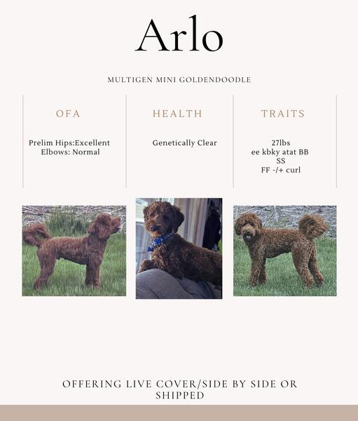 message frenchcreekdoodles about this ad Arlo is a gorgeous Mini Goldendoodle stud with gorgeous wavy deep red plush coat. Arlo has a very laid back and affectionate personality. He is always being stopped to say how beautiful he is. Arlos OFA prelim hips are rated Excellent and his elbows rated normal. His genetics are: ee kbky or kyky atat BB SS curl. He weighs 27lbs. He is genetically clear. We also have Toy and Mini Poodles and Goldendoodle studs available. Our stud fees are $900-1500. Arlos fee is $900. Located in Platteville Wisconsin but happy to travel to meet! |