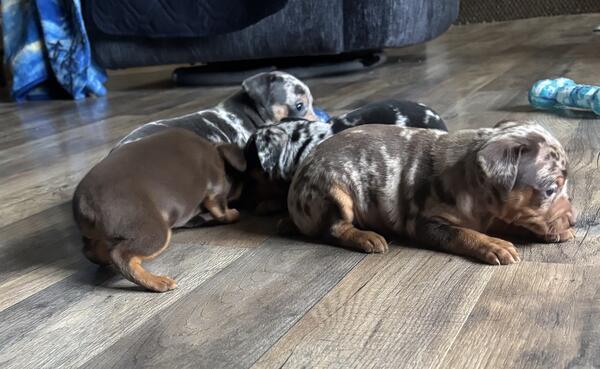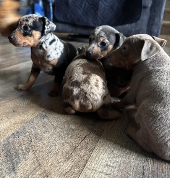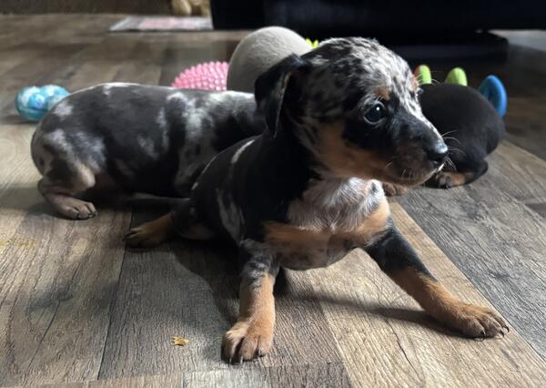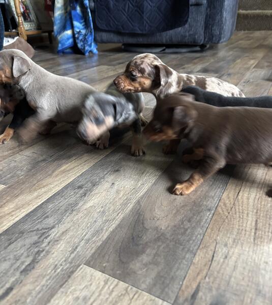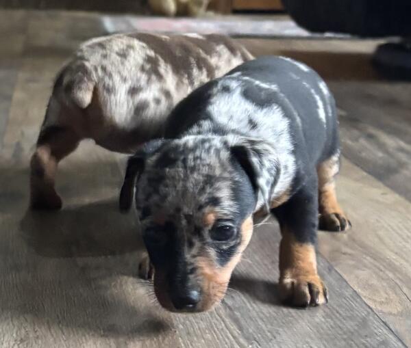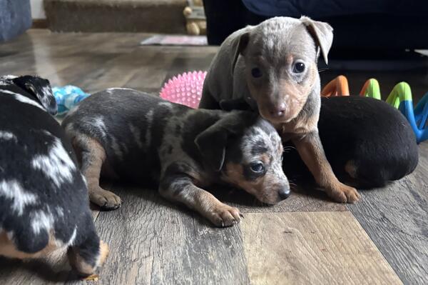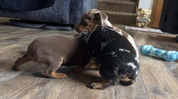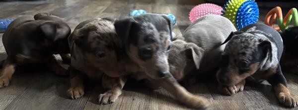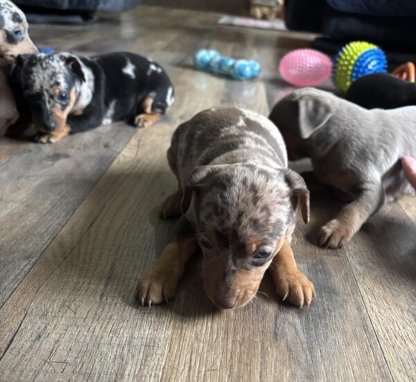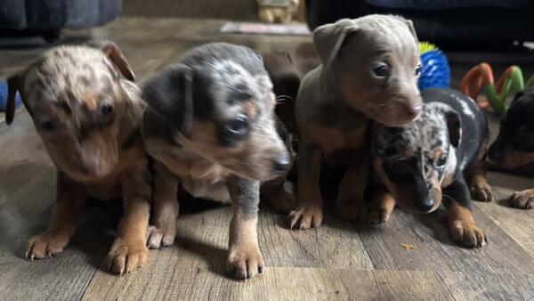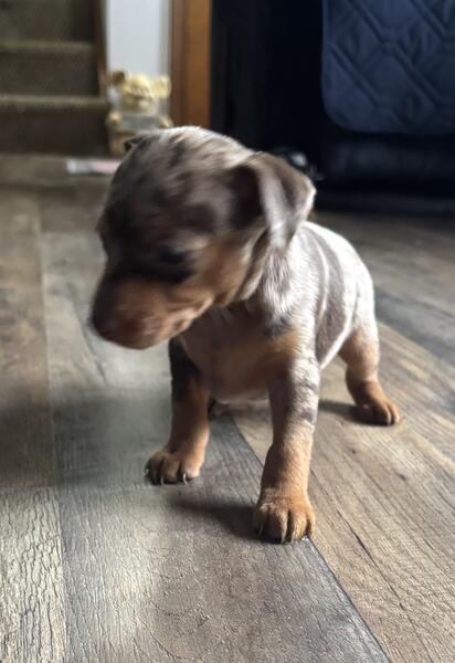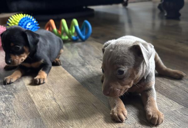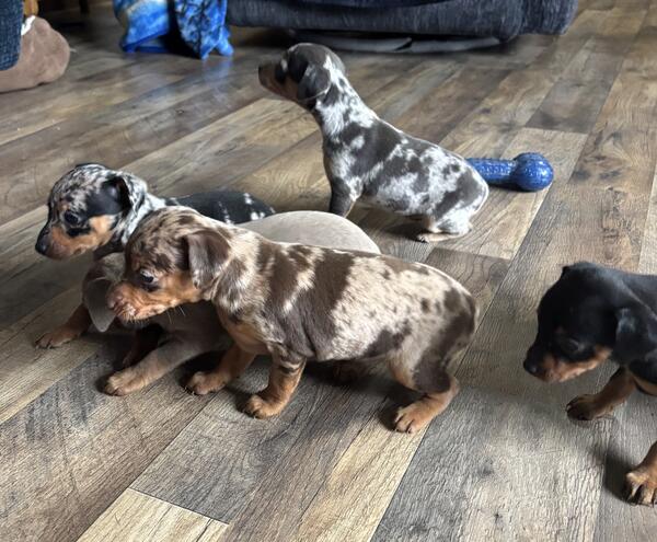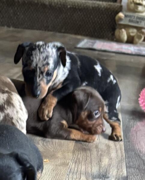 message minpinohio about this ad I have 6 pups for sale 4 girls and 2 boys. Boys one chocolate and one fawn $800. Girls one black sold, one black Merla, one chocolate Merla, and one gray Merla. The Merla's will be $1200. They are all registered and have shots or dewormed have their declaw removed and tails cut. They are beautiful pup that will be ready for Christmas Call or text 330.324.2023 |