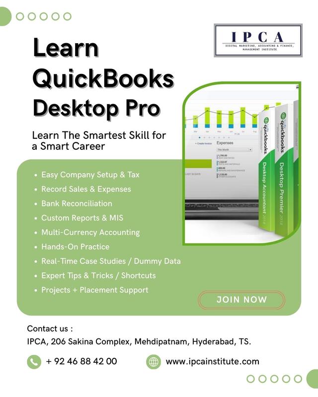 message ipca about this ad IPCA Institute of Professional & Computerised Accountancy Best in Practical Accounting and Accounting Software Training (Tally, Focus, Wings, QuickBooks, MYOB, SAGE, Peachtree, MS Office) Real-time experts with 25+ years of experience Address: 206 Sakina Complex, Above Maharaja Sweets, Mehdipatnam, Hyderabad Call Mobile: 9246884200 or Whatsapp Unlock your accounting career with hands-on training today! |
