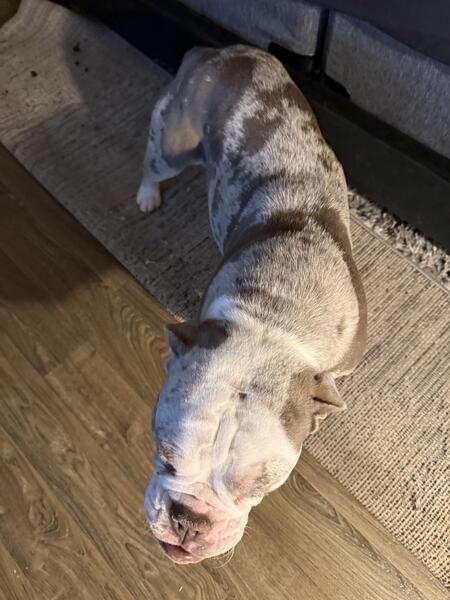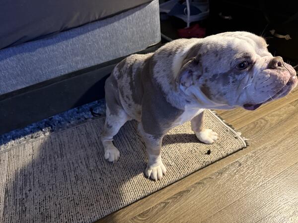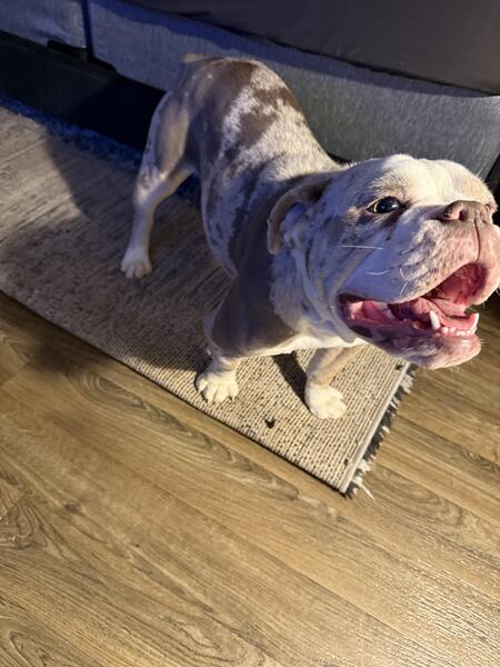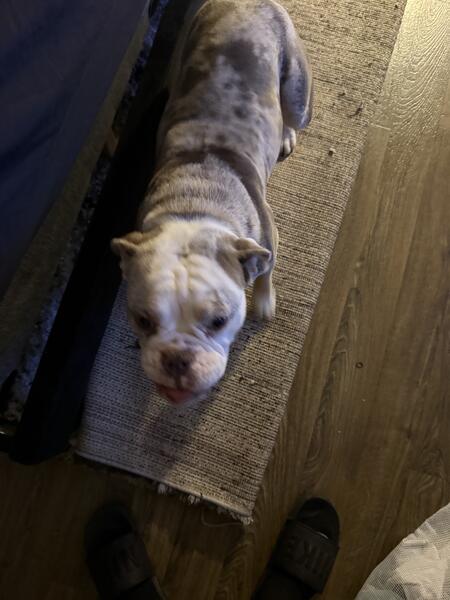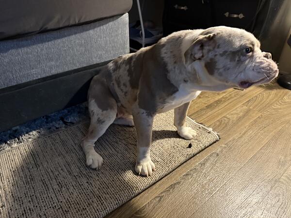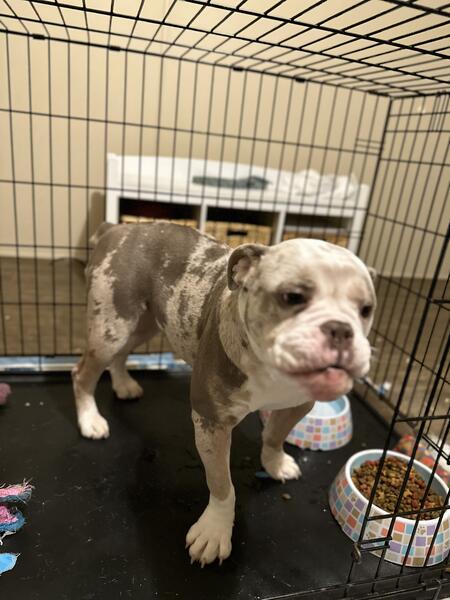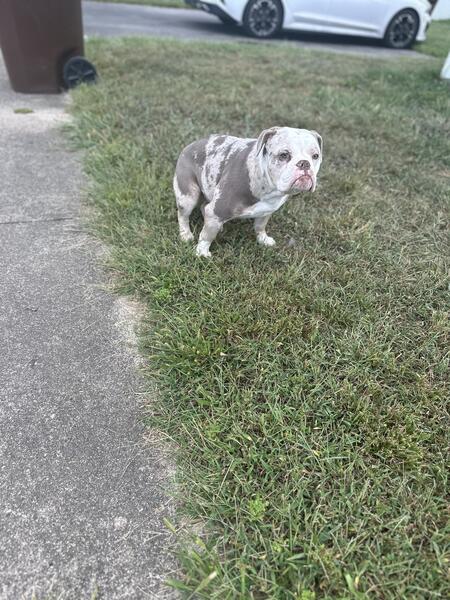 message whtsp116 about this ad 1 year old Lilac merle olde English bulldog she had her first heat in August the second one should be here February she also has papers and is registered through the IOEBA |