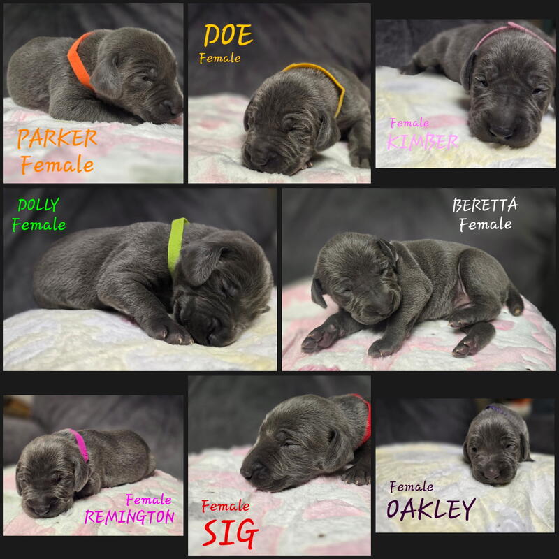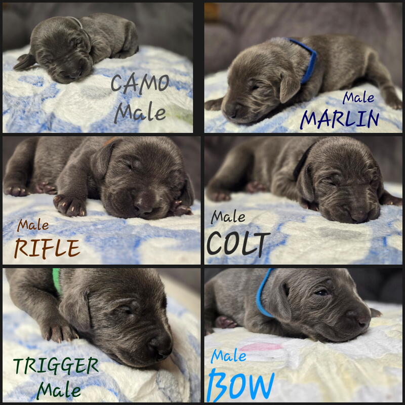 message rare14blueweimys about this ad EXTREMELY RARE all BLUE Weimaraner pups born December 09, 2025 8 female 6 male . AKC eligible, both parents AKC registered and 4 generation pedigree . Tails docked. Dueclaws removed. Vaccinations and dewormed by the time ready to go to new home. $500 non- refundable deposite to hold pup. |