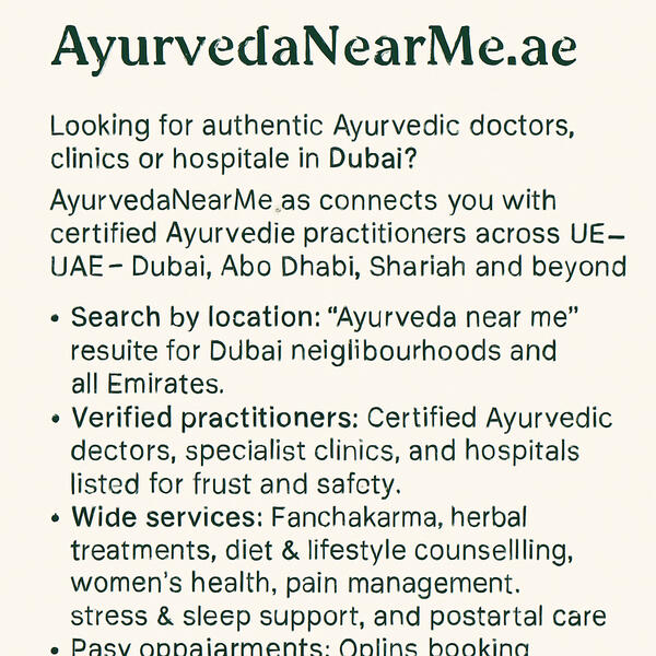 message diglip about this ad Looking for authentic Ayurvedic doctors, clinics or hospitals in Dubai? AyurvedaNearMe.ae connects you with certified Ayurvedic practitioners across the UAE Dubai, Abu Dhabi, Sharjah and beyond. Find nearby Ayurvedic consultations, Panchakarma detox, Abhyanga & therapeutic massage, personalized Ayurvedic treatment plans, and herbal medicine pharmacies all filtered by location for easy booking. Why choose AyurvedaNearMe.ae? Search by location: Ayurveda near me results for Dubai neighbourhoods and all Emirates. Verified practitioners: Certified Ayurvedic doctors, specialist clinics, and hospitals listed for trust and safety. Wide services: Panchakarma, herbal treatments, diet & lifestyle counselling, womens health (Shatavari, Ashoka chronic pain management, stress & sleep support, weight management, and postnatal care. Easy appointments: Online booking, phone/WhatsApp contact, teleconsultation and walk-in options. Lead generation for clinics: Ayurvedic doctors and hospitals can list to get targeted local leads across Dubai & UAE. Find the best Ayurvedic care near you compare ratings, read clinic profiles, view services and book appointments in minutes. Providers: boost visibility in Dubai by listing your clinic today and capture patients actively searching for Ayurvedic treatment in Dubai. httpsayurvedanearme.ae/ message diglip about this ad |