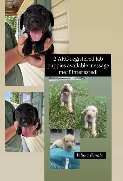 message jsphwk7099 about this ad I have 4 AKC registered Lab puppies born June 13,25 ready to go home to their forever homes! 1 yellow female 1 chocolate male 1 chocolate female 1 black female $600 Located eastern NC Been dewormed weekly from week 2 on Have had first round of shots Paperwork in hand More pictures to come Call or text 910 three 85-7778 |