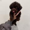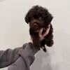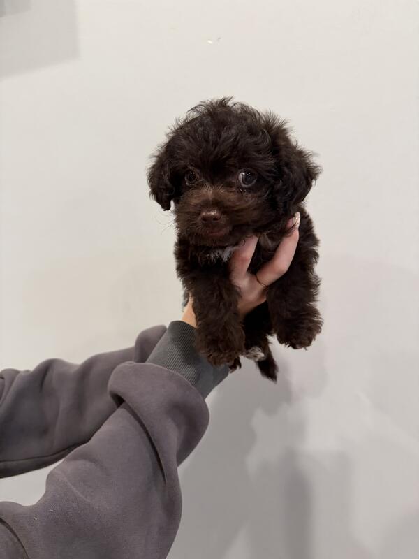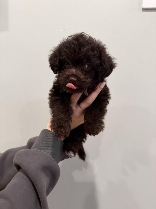 Six week old Yorkie poo, mother is a miniature poodle and dad is a Yorkie, black and has white on chest.