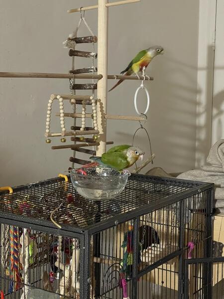 Rehoming my green cheek conures. they are sweet and playful. the rehoming including the cage, food, and toys.