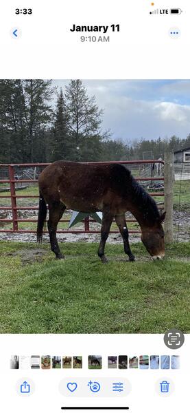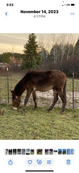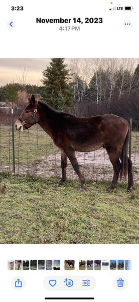 message flaghorse about this ad Mule gelding 15hh, 5 yr, has Appaloosa characteristics, few dark hip spots and roaning blanket, mottled skin, stripped hooves, comes when called, jumps in a stock trailer, not much training but likes wither and back scratches. Will follow a grain bucket. In Virginia MN area, 4zero 499 9 three, 3000 or reasonable offer |