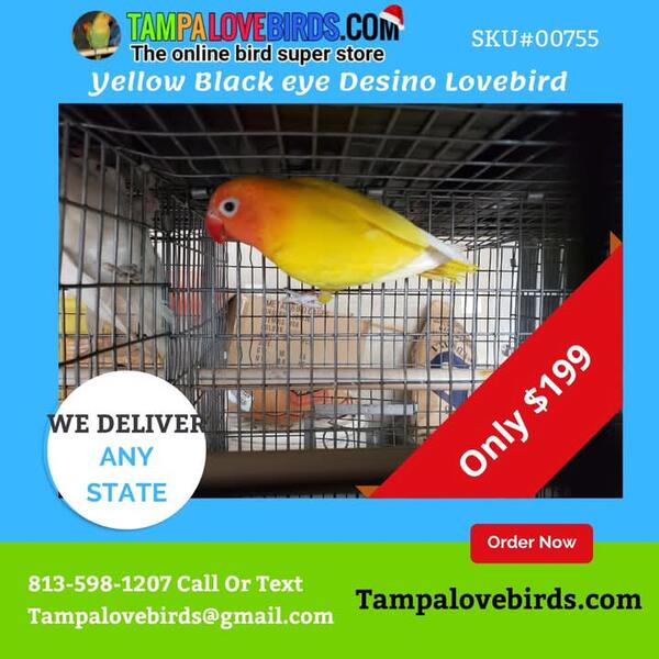 message tampalovebirds2024 about this ad We have beautiful yellow Desino Lovebirds for sale. Babies and adults. They are rare color to find. For more info call or Text 813-598-1207 and to see pictures and prices visit our store online 24/7 Tampalovebirds.com |
