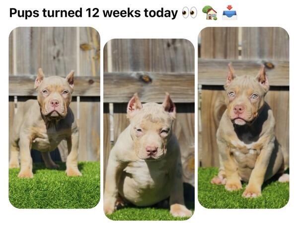 message rbrtm818 about this ad 12 week xl bully pups heavy bossy blood lilac tri lilac tri Merle 1 male 2 females available 2500 abkc registered or 2k pet home located in Corpus Christi Texas text (361) 677-6667 |