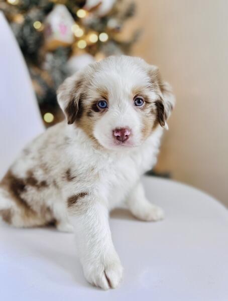 message jessiflores712 about this ad Miniature Red Merle Australian Shepherd puppy with blue eyes for sale. Puppies are raised indoor and recieve lots of love. This breed is extremely intelligent, loyal, and obedient. They are also very good with children. He will be ready for his forever home on or around Dec. 19th. Price includes first vet check up and first round of vaccines. |