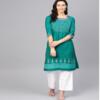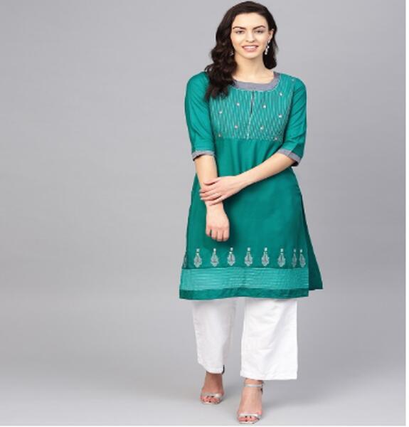 message rohinee about this ad Product Code: 10206885 Green and silver yoke-design straight kurta with embroidered detail, has a square neck, three-quarter sleeves, straight hem, and side slits The model (height 5'8 is wearing a size S Make a statement with this elegant kurta from W. This green piece is a stylish option for a nice family function or event when teamed with churidar leggings and classic flats. Viscose Rayon Hand-wash httpsmyntr.it/y5q1Uhb |