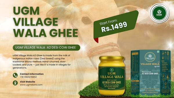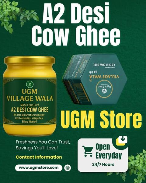 message ugmstore about this ad A2 Desi Cow Ghee 100% pure A2 Desi Cow Ghee by UGM Village Wala made using traditional bilona method from grass-fed Indian cows. Boost immunity and health naturally. UGM Village Wala A2 Desi Cow Ghee is handcrafted from the milk of desi Indian cows using the ancient bilona method. Rich in A2 protein, this ghee is free from chemicals, preservatives, and additives. It offers a natural source of healthy fats, supports digestion, boosts immunity, and is perfect for cooking, Ayurvedic use, or daily consumption. Made in rural India with care and tradition, every drop of this golden ghee brings purity, nutrition, and taste to your kitchen. Highlights for Bullet Points: 100% Pure A2 Desi Cow Ghee Made using traditional Bilona method From grass-fed Indian cows Rich in antioxidants and healthy fats No preservatives or chemicals Ideal for cooking, fasting, and daily use Strengthens immunity and improves digestion Recommended Use: 1 spoon daily on empty stomach Cook with it for better digestion and taste Use in Ayurvedic remedies or rituals Bitmap Bitmap Bitmap Bitmap Bitmap Bitmap httpsx.com/villagewal17859 Contact Details Address: PANSABDA, BISHUNPURA, AZAMGARH, UP, Azamgarh, Uttar Pradesh-276405 Email: sales@ugmstore.com Phone: +91 9161678852 Website: www.ugmstore.com buy now this order best quality ghee message ugmstore about this ad |