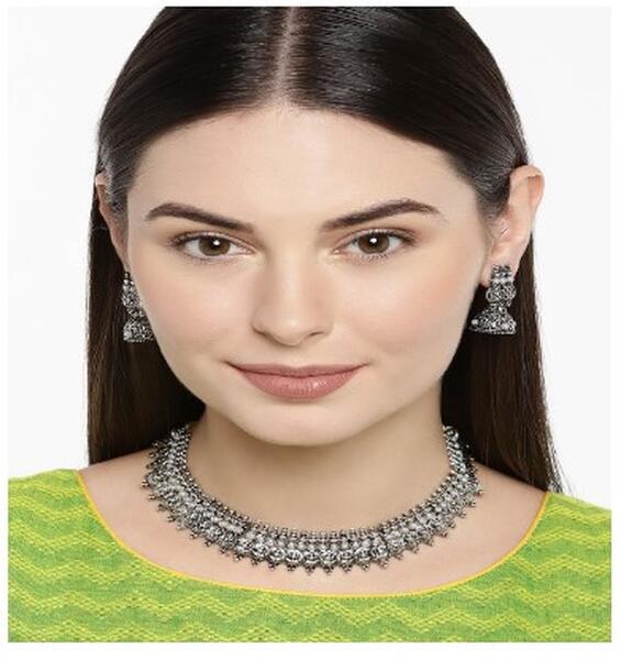 message rohinee about this ad Product Code: 7197931 This jewellery set consists of a necklace, and a pair of earrings Silver-toned necklace with stone-studded detailing, secured with a drawstring fastening A pair of matching jhumkas with artificial stones detailing, secured with a post-and-back closure Necklace Length: 10 cm Earring Length: 3.5 cm httpsmyntr.it/zoyUR5L |