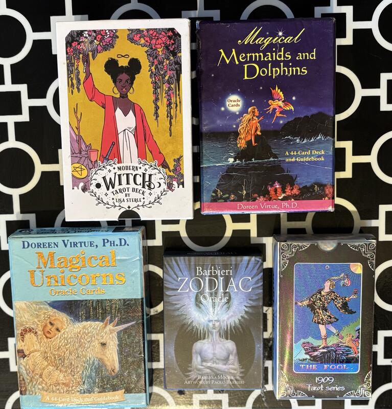 message skylaboutique about this ad Various Tarot Card Decks $10 each or all for $45 -Modern Witch Tarot Deck by Lisa Sterle | Barely used- like new. -Magical Mermaids and Dolphins Oracle Cards by Doreen Virtue, Ph.D | used- good. -Magical Unicorns Oracle Cards by Doreen Virtue, Ph.D | used- good. -Barbieri Zodiac Oracle by Barbara Moore Artwork by Paolo Barbieri | Barely used- like new. -Collection Edition Gold foil Tarot 1909 Tarot Series | Barely used- like new. Local Pick Up Only |