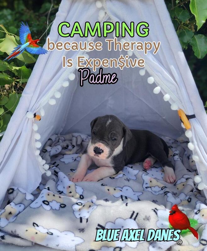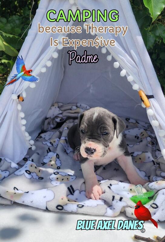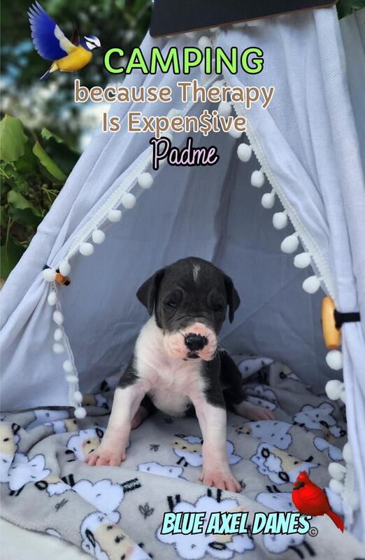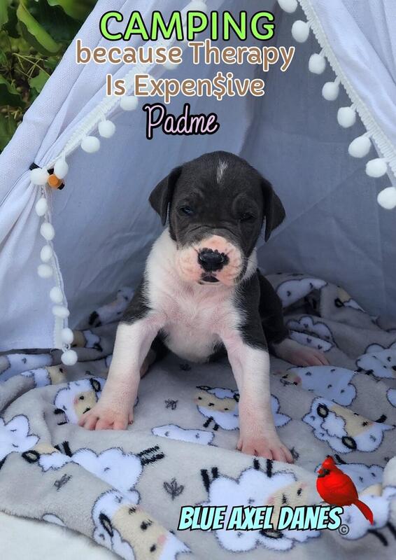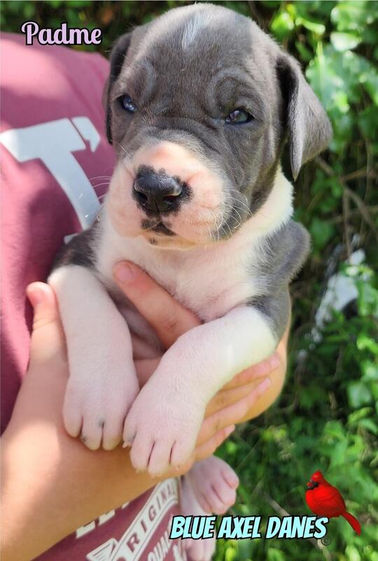 message blueaxel about this ad Padme is a Blue Mantle Great Dane Puppy. This past Monday she turned 4 wks old and will be ready to go the last week of this month(June) Padme will have several dewormings, 2 vaccines, health Guarantee and puppy pack when its time to meet her parents. We do require a completed application. Those can be fount on the website at blueaxeldanes.com Padme is very lovable and is very smart. Shes already caught onto were to go to do her potty business. She loves kids and will be well socialized by the time she heads home. Padme is 70% Euro imported lines and will be a beefy girl. I have a sister from another litter and you can not beat the personality of these babies. Loves everyone and just ready for any adventure. Will follow you to the end. Give me a yell if youd like to add her to your family. |