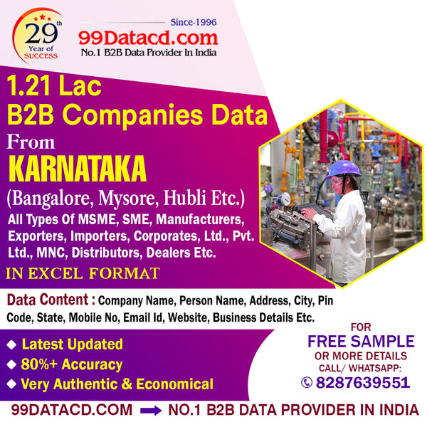 message dataprovider about this ad Are you seeking for top verified Bangalore companies list ? 99Datacd, a leading B2B database service provider company in India, offers list of companies in Bangalore at affordable prices. 19,881 companies in Bangalore / Karnataka (covering all trades) with company name, address, city, PIN code, contact number, email, business category - in Excel format. The data includes essential content such as company name, address, mobile no Email, website, business details and many more. All the data is available on the website in an easily downloadable Excel format for your convenience. Get 30% discount off on data. Pay and Download today! For free sample/ more details, call our experts Call/ Whatsapp : 8287639551 Email Id: sales@99datacd.com Address: 206, RG Trade Tower, Netaji Subhash Place, Delhi - 110034, India Website: |