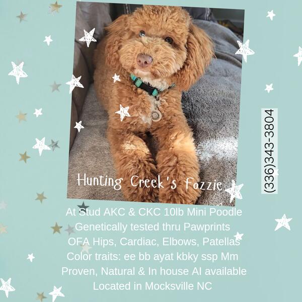message huntingcreekk9s about this ad Fozzie is our Red Hidden Merle Miniature Poodle stud. He is dual registered thru AKC & CKC. He has one blue eye and passes that trait along to alot of his offspring. Fozzie has been genetically health tested thru Pawprints and his traits are ee bb ssp Mm kbky ayat FF. He has also been OFA tested for hips, cardiac, patellas, elbows, and eyes. He is OFA CHIC Certified. He is available for stud services. We try for three ties over the course of a few days. Stud fee is due at time of 1st tie or pickup of your female if staying for breeding days. We offer a stud contract that guarantees puppies. For more information call and or text Adria. Thre3 thre3 six ) thre3 f0ur thre3 thre3 eight zer0 f0ur In house artificial insemination is available for larger females and we do offer a stud contract. |