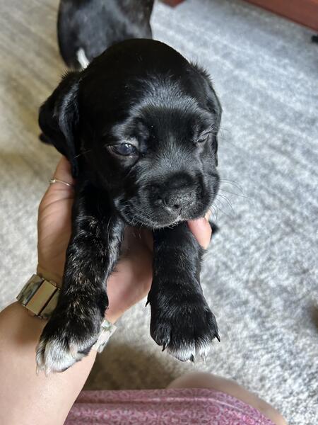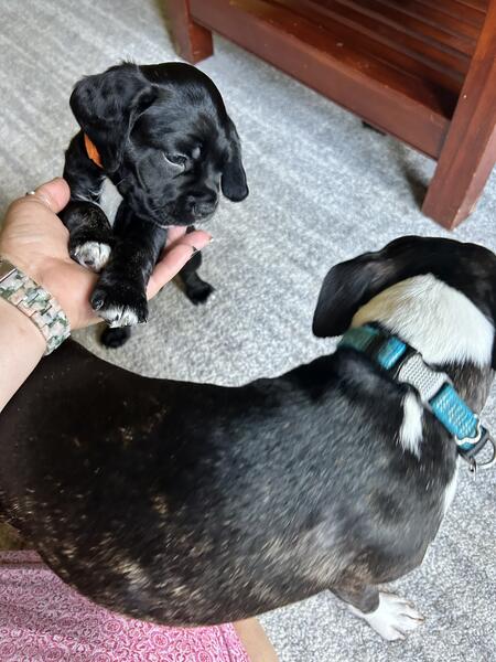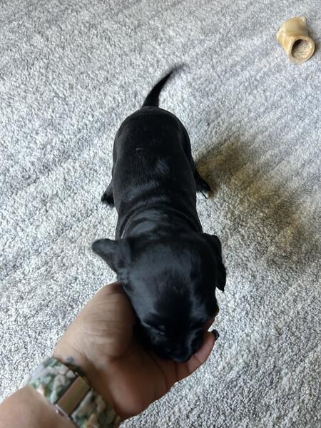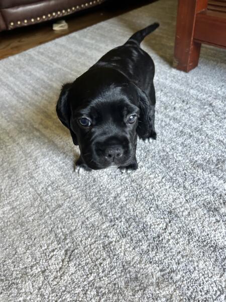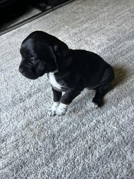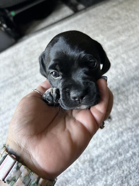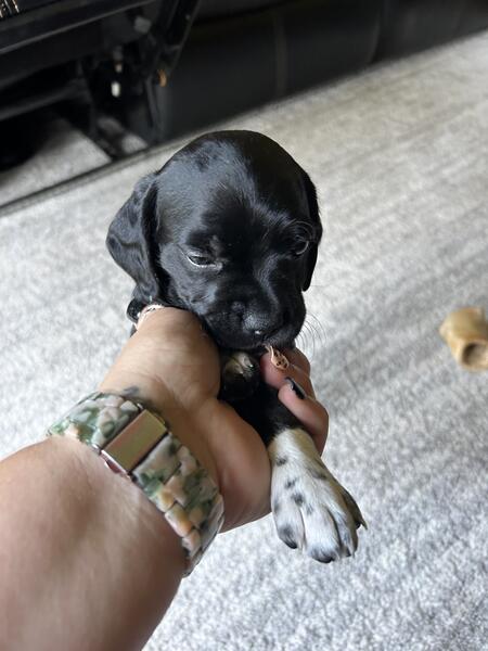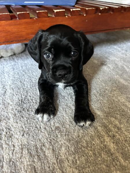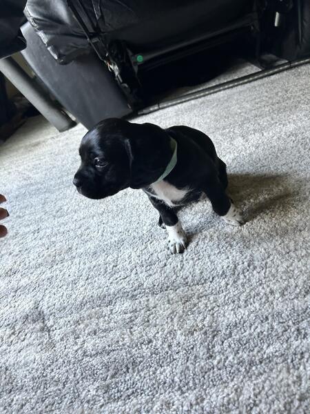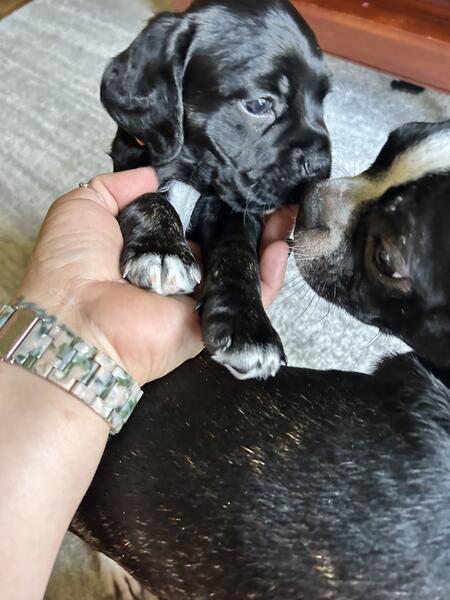 message singerje1 about this ad Mom was a Boston terrier dad was a cocker spaniel. Mom is CKC registered dad is pure American cocker no papers. Puppies are four weeks been wormed every week and seen the vet. They will come with their first shots. Asking a fee message me for more information. One male with orange collar one female with teal collar. The boy is currently 6lbs and the female is 4lbs. Mom is under 20lbs and dad was around 30lbs. They are being socialized and will stay with us until eight weeks. |