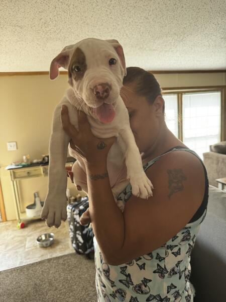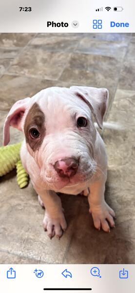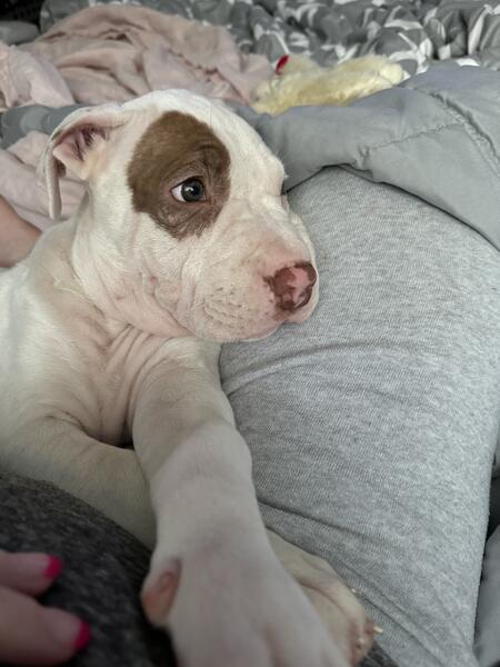 message kisses1274 about this ad I have a male 10 week old white and chocolate color pit mix with American bully. He is such a big baby full of cuddles and love! He loves other animals and loves people and kids his name is olive and is just a sweet sweet boy! He is very smart and being potty trained and learning commands sit shake and stay. |