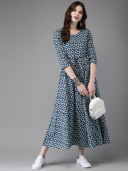 message prerana about this ad Product Code: 10297751 Blue printed A-line kurta, has a round neck, three-quarter sleeves, and flared hem, tie-up detailing on the waist This fusion Kurta can also be styled as a Dress The model (height 5'8 is wearing a size S This swanky kurta from Anouk will take your personal style to new heights. For your next dinner party or family gathering, this blue piece pairs well with dark leggings and chic flats. 100% viscose Machine-wash httpsmyntr.it/14Es20g |