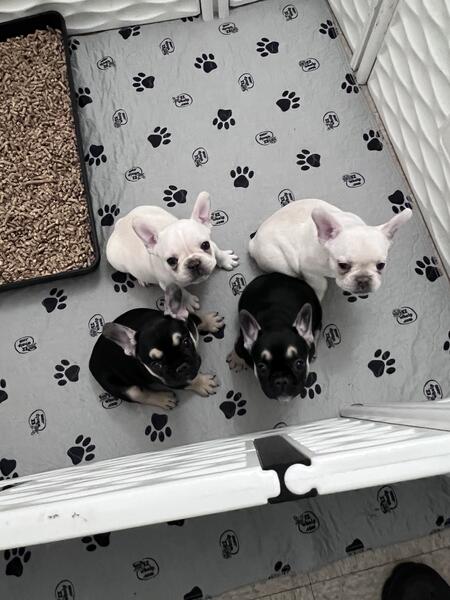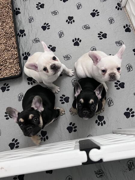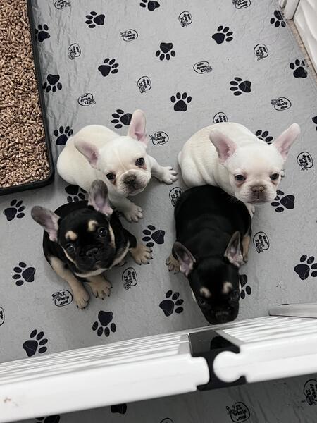 message mrguzzman718 about this ad Beautiful French bulldog pups ready for their forever homes. Two white ones are males and and the two black tris are female. Mother is a a black tri and father is a blue tri. AKC paper work |
