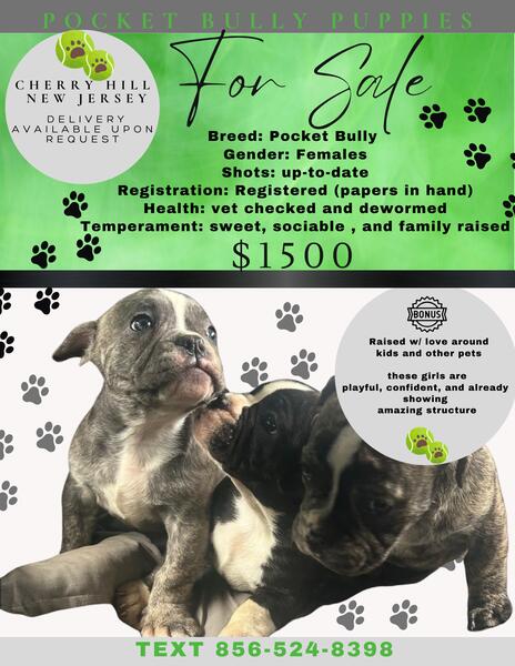 message tournkennel about this ad Adorable Pocket Bully Puppies Ready for Their Forever Homes! Looking for the perfect companion? Our beautiful Pocket Bully puppies are ready to bring love, loyalty, and fun into your life! Bred from top-quality bloodlines, these pups are the ideal mix of compact size and muscular build, with calm, affectionate temperaments that make them perfect for families or individuals alike. Key Features: Age: 10 weeks old Health: Vet-checked, dewormed, and up-to-date on vaccinations Temperament: Friendly, playful, and socialized around kids and other pets Size: Pocket Bullies short, stocky, and strong with big personalities Color Options:Blue Brindle, Brindle White, Blue Merle These pups are raised with love in a clean, family-friendly environment and are ready to make a smooth transition into your home. Serious inquiries only. Message for pricing, photos, or to schedule a visit. Delivery options may be available. message tournkennel about this ad |