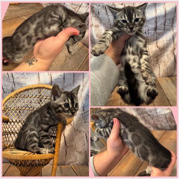 message crystalballcritters about this ad Beautiful Silver Charcoal and tarnished silver female Bengal kittens located in Lancaster, WI. Can possibly meet a little ways. Parents are health tested clear & TICA registered Birthday is September 29, 2025 Ready to go home December 8th Dewormed Age appropriate vaccines Clear Vet Check Health Guarantee & Breeder Support Socialized to adults & children Using litterbox 100% of the time Come with goody bag full of food, toys, blanket and records $1000 pet price on spay neuter contract |