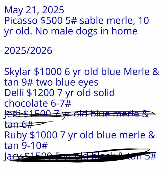 message ntz4pms27 about this ad UPDATE: Jacy & Jedi have found their home Must be picked up from my home. Will be spayed, have a dental, bloodwork, vaccines, heartworm test & vet exam. They are crate trained & need a FENCED yard. Good with other dogs cats & has been good with my kids. I do not promise my adult dogs to be housebroken. There is usually an adjustment period & that can include accidents. Please only contact me if you are SERIOUSLY interested. Dont spark a conversation & then ghost me when I reply. A simple Im going to pass works well if you decide she is not the right fit. 1/2 due at surgery schedule 1/2 when she goes home. References available. Contract required Please be prepared to give this dog time to get settled in. Sometimes it takes 3 months (or more) for a dog to adjust to a new home. Prices vary from $1000-1500 |