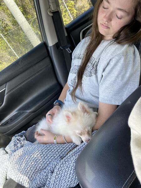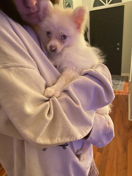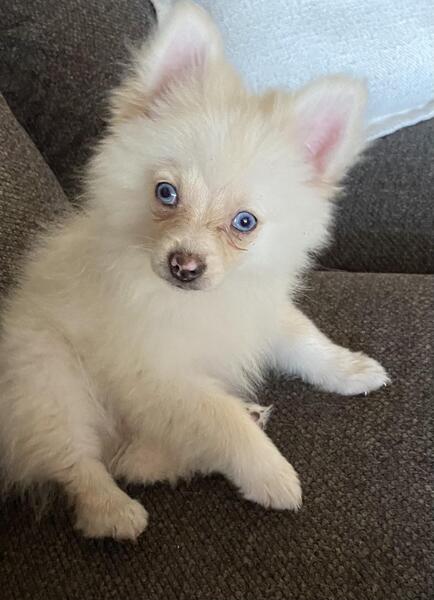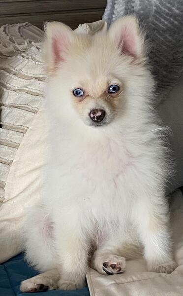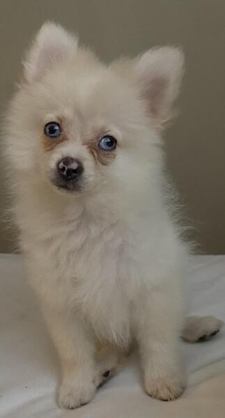 message sandywrn about this ad 14 week old female Pom puppy, cream, rare blue eyes. Estimated adult weight 7-8 lbs. CKC registered, microchipped, has had 2 rounds of shots and dewormer. Has been doing well at potty training, will go out almost every time you take her. She is very sweet and loves to be with you all the time. A definite lap dog! |