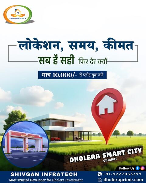 message dholeraprime about this ad Right Location, Right Time, Right Price Then Why Wait? Own your dream home or make a smart investment in Dholera Smart City, Gujarat! Book your plot with just 10,000 and be part of Indias first Greenfield Smart City. Prime Location Government Approved Project Rapidly Developing Infrastructure Shivgan Infratech the most trusted developer for Dholera investment Dholera Live Plot Booking Status: |