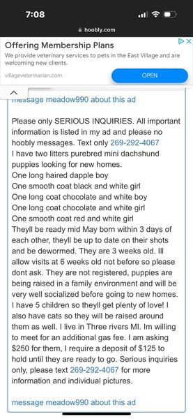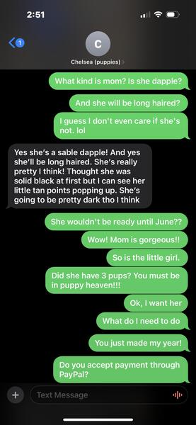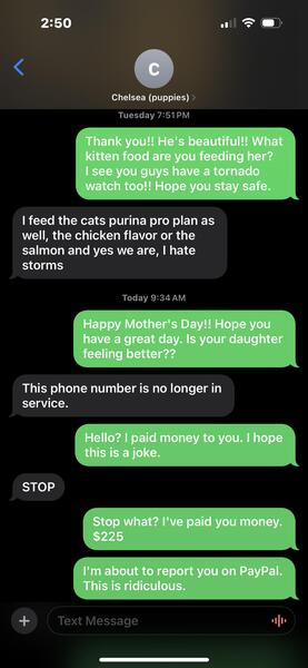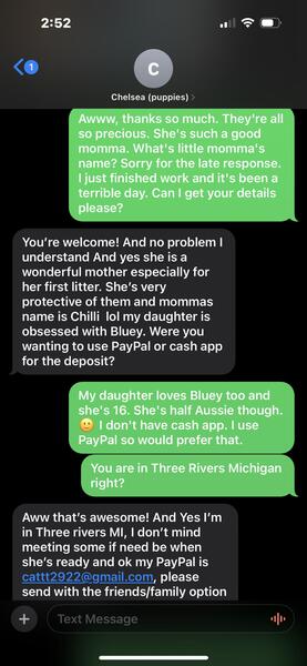 message dzdhc385 about this ad This lady scammed me and probably others out of deposit money for a puppy and a kitten. She even kept it going for weeks after I sent her payment. Then today of all days (Mothers Day) when I texted her she texted back stop and then leave. Her contact name on here was meadow 990. She says her name is Chelsea Jones and shes from Three Rivers, MI. She wanted paid through cash app or friends and family through PayPal. Dont ever pay through friends and family as you most likely wont get your money back. Also, be wary of new accounts on here. Im posting her ad, photos she posted and some text for content. Text her number at 269-292-4067 to let her know what a great person she is. Her number still works, but Im sure shes blocked me by now. |