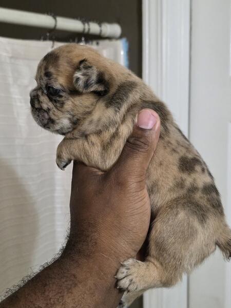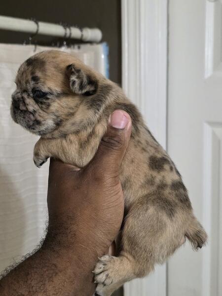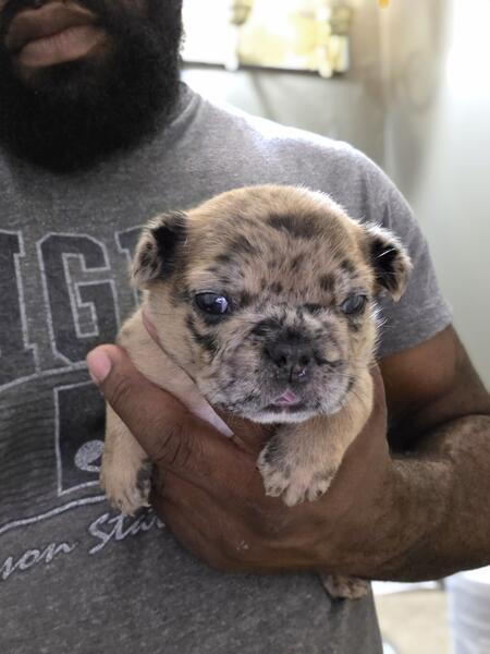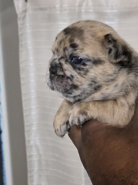 message cottonpaws about this ad Welcome, everyone, to Cotton Paws. We are delighted to introduce our incredibly handsome and charming little boy, Chocolate Chip. He is an AKC French Bulldog, a beautiful merle with the notable pink gene and fluffy traits. This little guy promises to have a big, delightful personality. His father is a full pink fluffy, and his mother is a stunning rojo merle, so he's truly a special pup. |