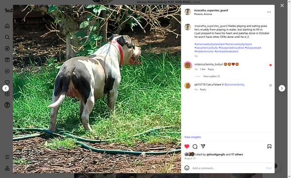 message solohorse about this ad This standard / classic boy has blue piebald markings with ticking and a stand out split blue eye-patch. Both parents are Embark clear and 100% American Bully. Father is Ch Zhuko Blue Spirit and 100% razors edge bloodline standard blue tri color. His bloodline goes back to founding of breed with dogs such as BluePrides Pumba and Cairo, Remembering Cairo with dogs from Kaozbullies and BluePride lines . Mother is a classic girl, our Nimbus was single registered from gottyline and razors edge, she passed OFA testing of hips, elbows, cardiac and patella and she is Embark clear too. Mom is blue piebald tri carrier. This boy has a sweet friendly personality and loves to play, He loves to play catch and fetch and loves to go for walks on a leash. He can chase drone for exercise and has some good high jumps so we will do athletic games like weight pull or lure coursing. He has zero temperament issues and zero health issues and no breathing issues. He has passed cardiac so hips will be done after New Years. If you want health and athleticism he can add that. Stud fee will be low for intro so i can see what he can do so $500 or pup back from approved female since he has never been bred yet. Female must be registered UKC American Bully or ABR. Female cannot have 2 copies of piebald because too much white one copy piebald is fine . If Female is health tested I will give discount. Videos available on request. Embark available on request. We are located in Arizona 18 inches tall 80 pounds 23 inch head so far. UKC and ABR OFA cardiac normal OFA patellas normal Embark clear EmEm KBky atat Ssp, BB, dd, NN II Rr Ghost Tri per DNA testing Ticking / Roaning gene ig inzaratha_superstes_guard message solohorse about this ad |