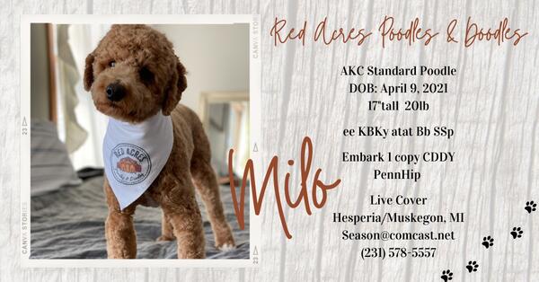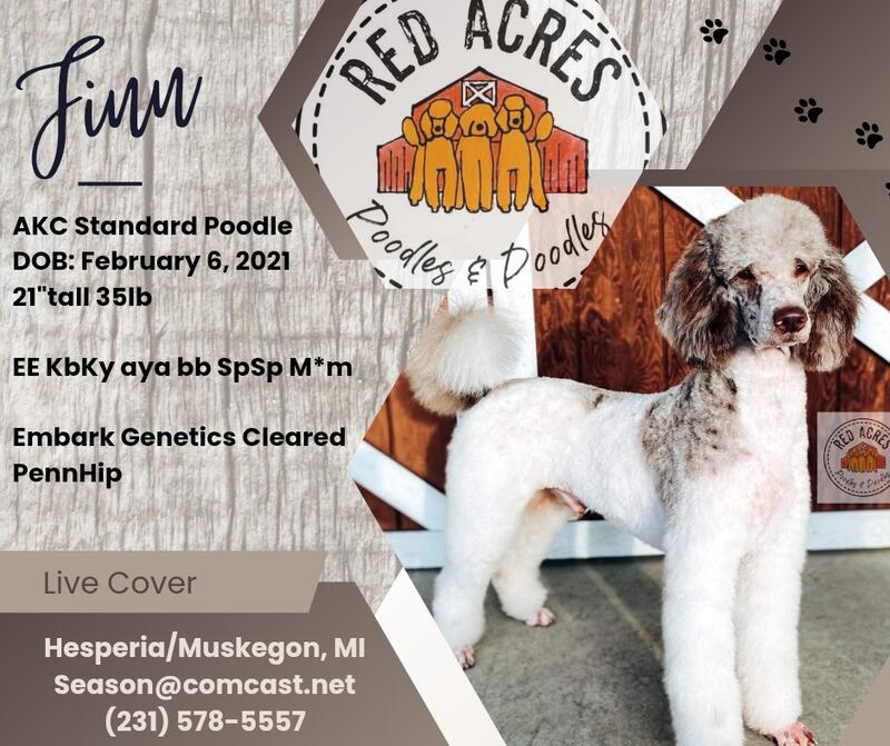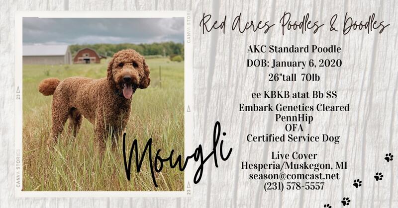 message mom4 about this ad Red Acres is offering Mowgli~ he is our 70 pound AKC beautiful red standard poodle he is a 9/10 red intensity he has had his PennHip, OFA, and health tested Mowgli is a certified service dog hands-down he is an amazing boy. Finn~ he is a AKC white and brown parti merle he is 35 pounds 22 inches tall has a very amazing laid-back personality, PennHip and health tested. Milo~ hes our little man on campus, AKC red 20 pounds 17 inches tall he is a PennHip, health tested. Coolest little dude you can meet. We do require a clear brucellosis test prior to natural breeding. RED ACRES POODLES AND DOODLES on Facebook and check us out or message us at 231-578-5557. *Hesperia Michigan *Fruitport Michigan |