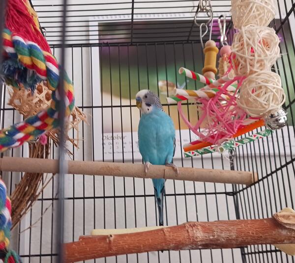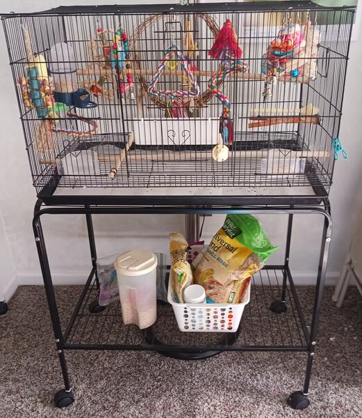 message coachtoby81 about this ad Two parakeet brothers - approximately 3 years old. They are very lively and not hand tamed. Very comical to watch them interact with each other. Cage, stand & food included. Cage is 30"wide x 18" deep x 16" high. Cage with stand is 46" high. Stand has wheels for easy moving. |