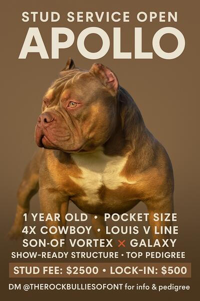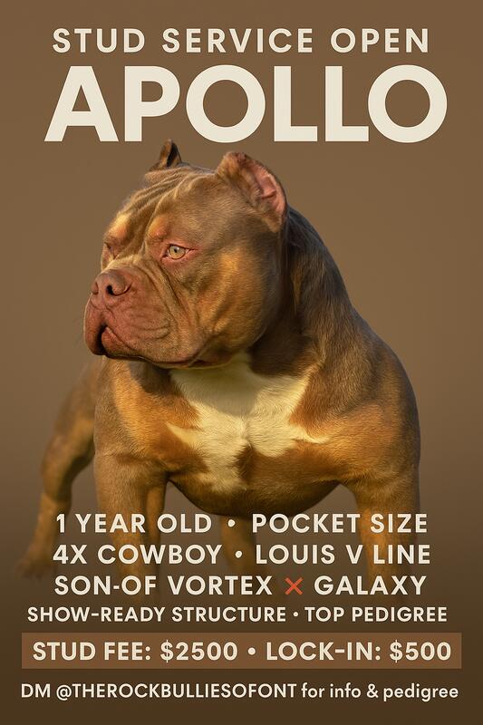 message bullies4life about this ad STUD SERVICE NOW OPEN APOLLO @THEROCKBULLIESOFONT Hes 1 year old and READY to work! 4X Cowboy Louis V Line bloodline Top-tier pedigree and it shows in every inch. Son of Vortex Galaxy Pocket-sized perfection, built like a tank with that clean, show-ready structure and undeniable presence in the ring. Whether youre stacking your program or leveling up your next litter, Apollo brings the HEAT. Stud Fee: $2500 Lock-in: $500 DM text or call 905-580-9798 to secure your spot or request his full pedigree. Let Apollo put your program on the map. |