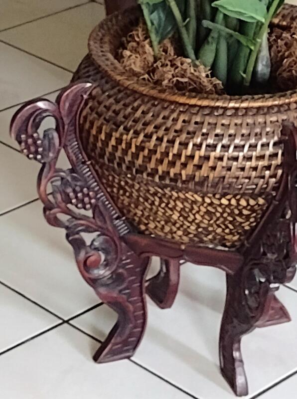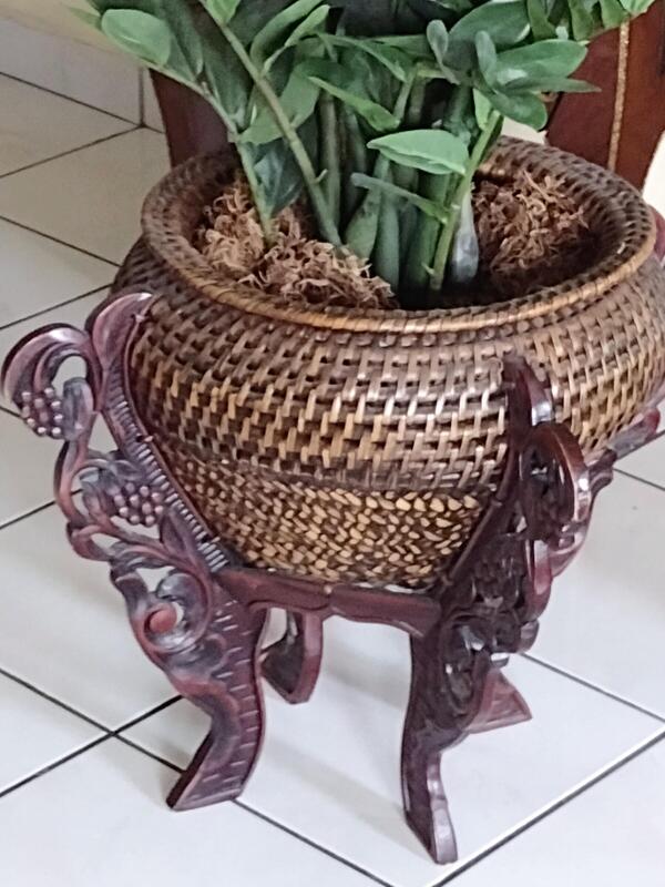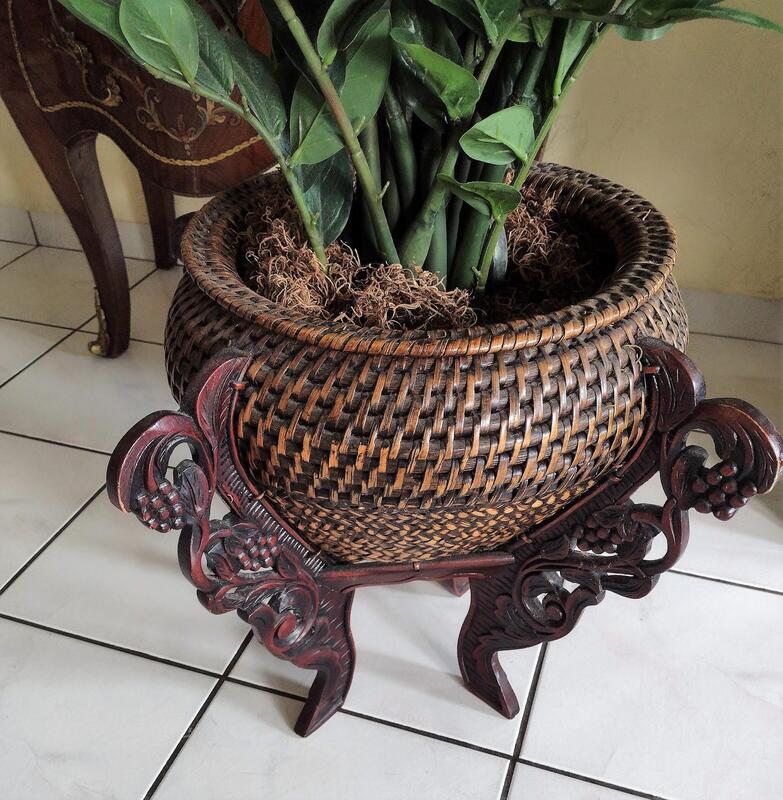 message pigglywiggly64 about this ad Created in China during the mid-20th century, this is a hand-woven rattan and bamboo vintage basket planter on a hand-carved ornate wooden stand. Basket is hand-stitched to the wood base with brown patina. Opens to a large space with wood reinforcement on the inside of the basket. Generously sized hand-woven vessel-style body. 4 carved wooden legs with hand-stitched bamboo brace. Light gilding brushed over the wood and basket. This basket planter would function well in any room of the house. Call or Text @ 786-589-9477 for more Information! Creado en China a mediados del siglo XX, este es un jardinero vintage de mimbre y bamb tejido a mano en un soporte de madera tallado a mano y ornamentado. La cesta est cosida a la base de madera con ptina marrn. Se abre a un gran espacio con refuerzo de madera en el interior de la cesta. Cuerpo de estilo vaso generosamente dimensionado y tejido a mano. 4 patas de madera talladas con un refuerzo de bamb cosido a mano. Un ligero dorado cepillado sobre la madera y la cesta. Este jardinero de cesta funcionara bien en cualquier habitacin de la casa. message pigglywiggly64 about this ad |