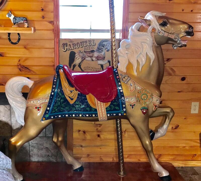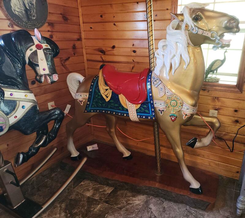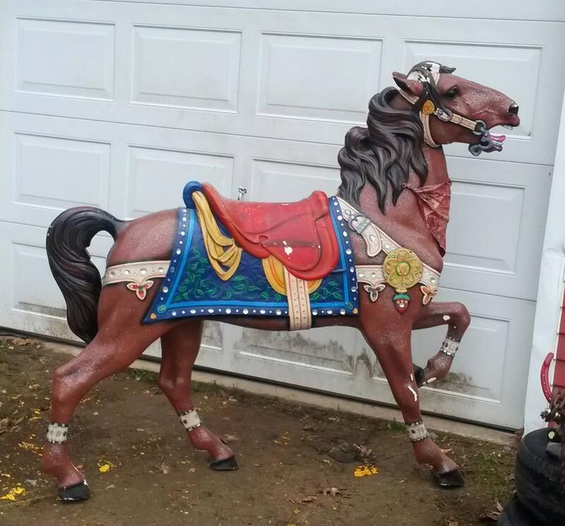 message bulldogmomma about this ad BEAUTIFUL FULL SIZE CAROUSEL HORSE, HEAVY FIBERGLASS, THIS HORSE WAS CREATED IN 2000, AS PONIES ON THE BEACH, ST JOESPH MICHIGAN, I FOUND HER ON CRAIGSLIST, IN SOMEONES GARAGE. SHE REPRESNTED THE FRUIT GROWERS, PHOTOS OF WHEN I AQUIRED HER, SHE WAS BROWN COLORED. NOW SHES A GOLDEN LADY, |