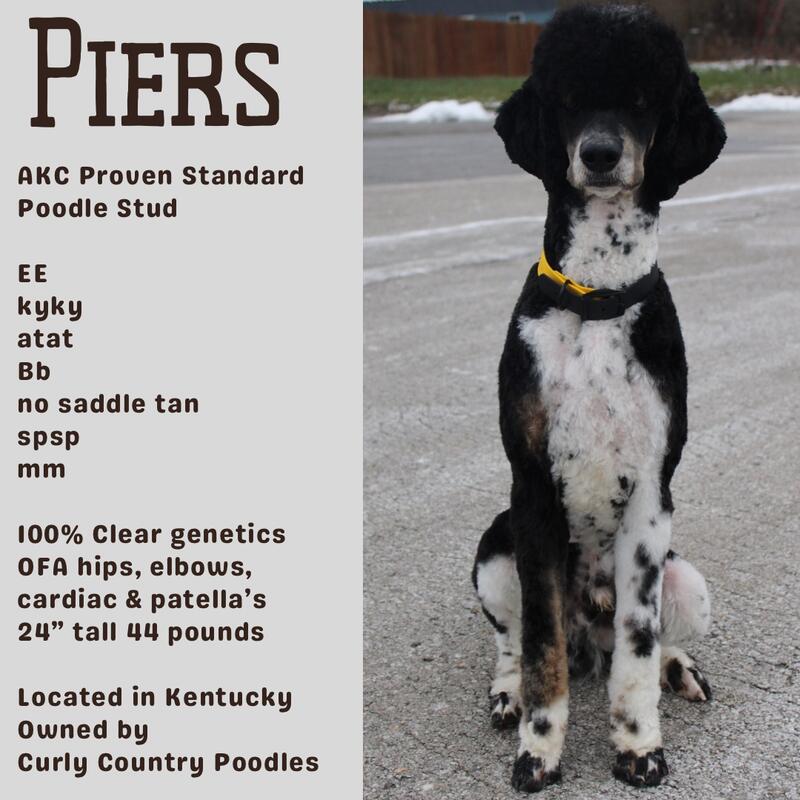message ccpoodlesky about this ad Akc registered Standard Poodle stud Black phantom Tuxedo 47 pounds Embark tested clear EE kyky atat Bb spsp mm OFA hips, elbows, patellas and cardiac Proven stud amazing temperament Located in KY |