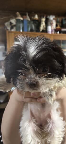 message granny4u2 about this ad One Chih-shih pup chocolate and white. Dark. 10 weeks. First shots and wormed. Loves kids. This cross is the best. Velcro baby. Will be smaller. Chihuahua size. Will meet. |
