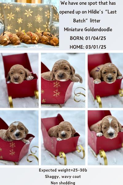 message westshoredoodles about this ad I have one puppy spot available on Hildie and Lokis currrent waitlist. Miniature Goldendoodle -Female 25-35lbs estimated weight Born: 01/04/25 Home: 03/01/25 WestShoreDoodles Please refer to my page for more information: |