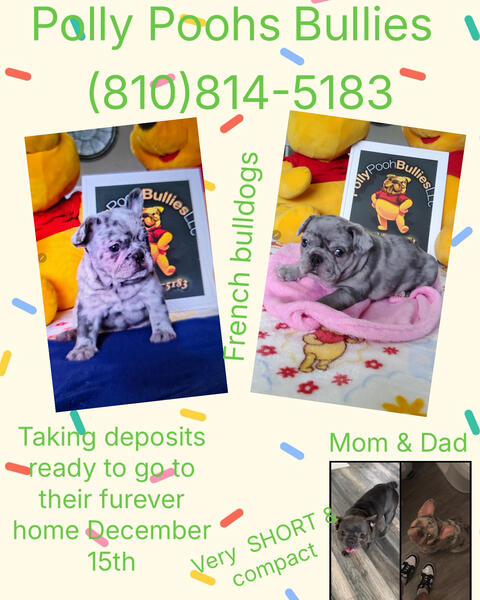 message pllln030 about this ad I have one male and one female blue tri Merle French bulldog puppies. Mom weighs 20 pounds dad weighs 18 pounds. These are very tiny French bulldogs. These puppies will come with a two year health guarantee fat check up-to-date on shot with the care package and unlimited support in raising your babies. Please call or text 810-814-5183 to video chat or to come see them in person. I do have payment plans available. These babies will be ready to go to their new forever Home December 25 they also will be microchips. Mom is on site. Dad is not. Please contact me for pricing. |