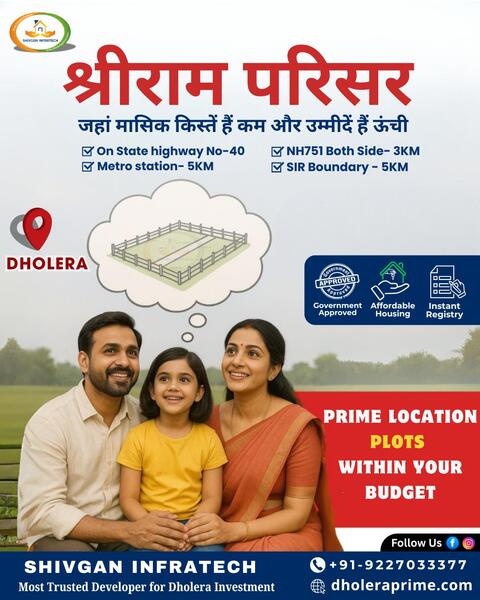 message dholeraprime about this ad Why Invest in Dholera Smart City? 1.Booming Real Estate market 2.Hub for global Industries 3.Backed by the Government's Smart City Mission 4.Part of the Delhi-Mumbai Industrial Corridor 5.Fast-track growth with high ROI potential Why Book Plot With Shivgan Infratech? 1.Book Your Free Site Visit Now 2.EMI Per Month Installment Available 3.Prime Location: Near Airport Diamond Circle & Expressway 4.30 Days Money Back of Booking Amount. 5.Best Price in Market. Shivgan Infratech presents property investment opportunities at Dholera Smart City. One of the finest residential amenities in the future metro city of Gujarat. It facilitates with supreme lifestyle and abundant amenities amidst the beauty of nature. Know Live Plot Booking Status- |