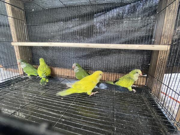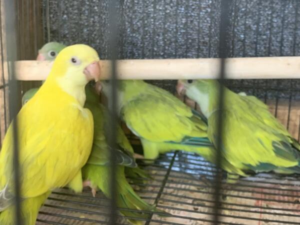 Quaker parrots, hatched in April. They can eat and drink on their own and are ready to learn words.