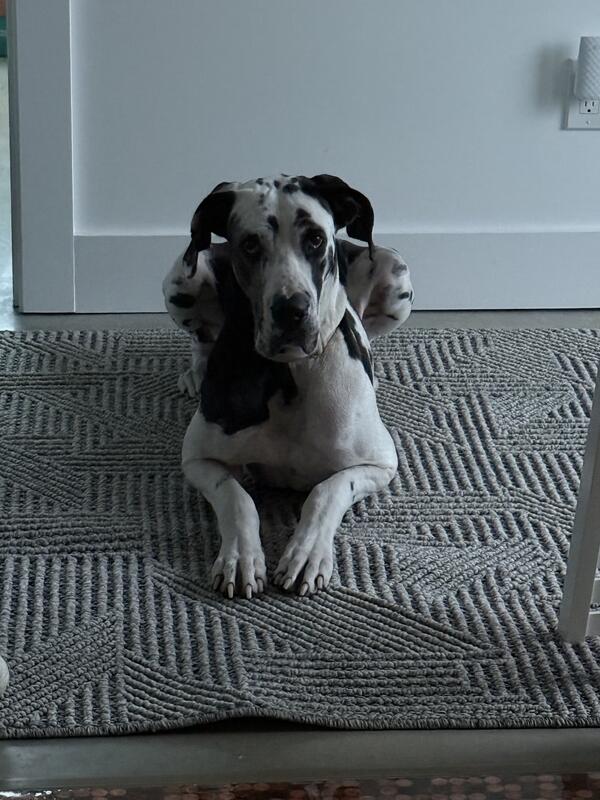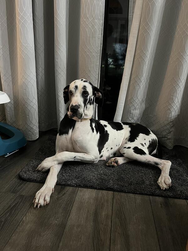 2.5 year old female harlequin Great Dane. Spayed. UTD on shots. House broken. Great with other animals. Loves to run.